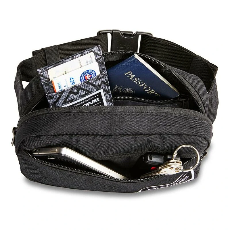 Das Dakine RAD Hip Pack besitzt zwei große Reißverschlussfächer. Im hinteren Fach befindet sich innen ein zusätzliches Reißverschlussfach für das sichere Aufbewahren von Papieren, Geld oder Schlüsseln. In das Hauptfach passen die Geldbörse, Taschentücher oder aber auch ein Mini-Taschenschirm. Diese Hüfttasche ist der sichere und stylische Begleiter auf Reisen, beim Sport, Wandern oder Fahrradfahren. Durch den individuell einstellbaren Hüftgurt mit Steckverschluss passt sie um (fast) alle Hüften.