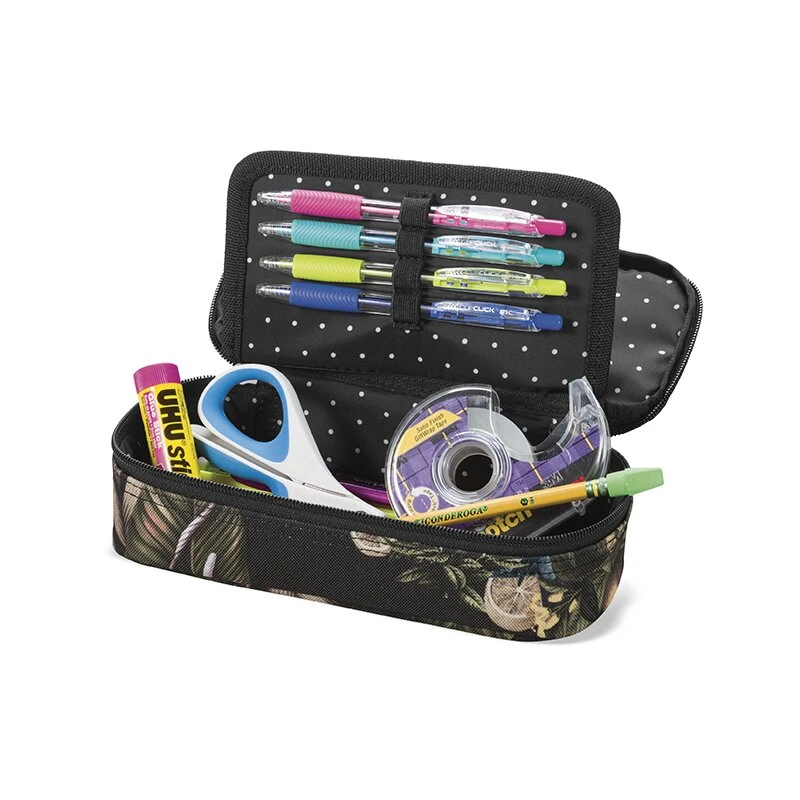 Das „Schlampermäppchen mit System“ – hier herrscht Ordnung! Es gibt Steckfächer für die wichtigsten Stifte und eine Trennwand mit einer kleinen Reißverschluss-Mesh-Tasche für Zettel oder Geld. Unter die Trennwand passen Schere, Leimstift, Textmarker, Tesafilm und Fineliner. In den Steckschlaufen auf der Trennwand können Sie beispielsweise wichtige Stifte, den Füller und das Lineal unterbringen, damit sie schnell zur Hand sind. Das Dakine School Case Federmäppchen ist gepolstert und besteht aus einer festen Form. Geöffnet wird es mit einem U-förmigen Reißverschluss.