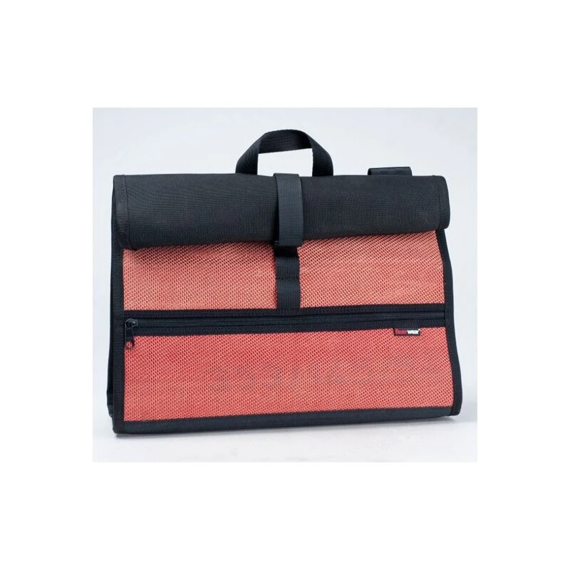 - Material: gebrauchter Feuerwehrschlauch, recycelte PVC-Plane, Autosicherheitsgurt